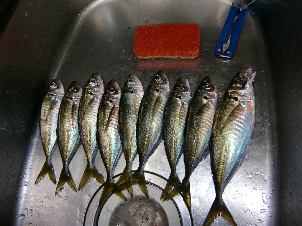 その後もぽつぽつとアジが釣れて、20cm~25cm位のアジをキープ、それ以下はリリースorにゃんこに献上しました♪